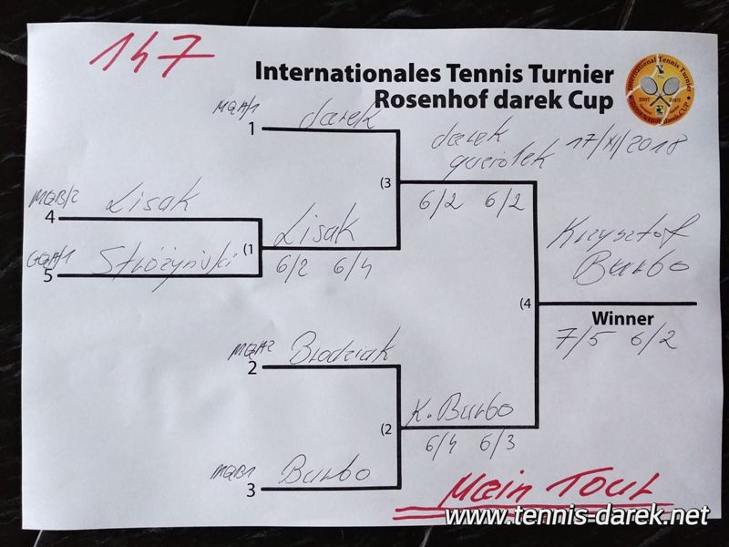 Krzysztof Burbo Bogatynia, wygrał mój turniej za drugim podejściem, to znaczy za drugim udziałem w finale. Swój pierwszy Tryumf, Krzysztof fetował podczas dokładnie 147 Turnieju Rosenhof darek Cup w dniu 17 Listopada 2018 - bijąc w finale darka guziołka 7/5 6/2. Całkiem ciekawy "akcent"