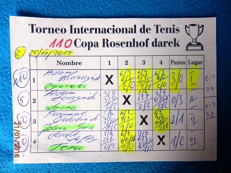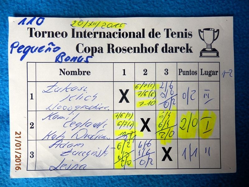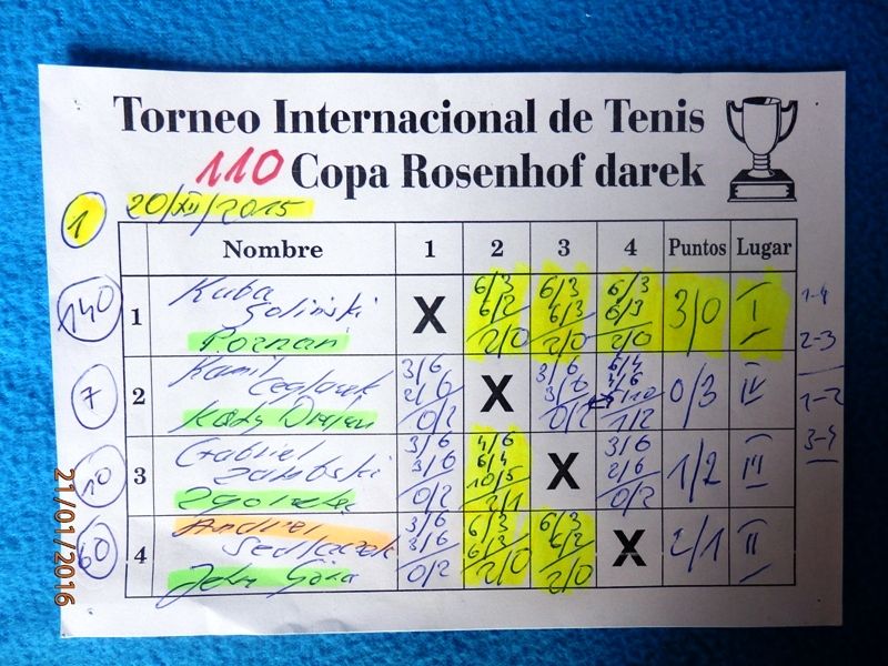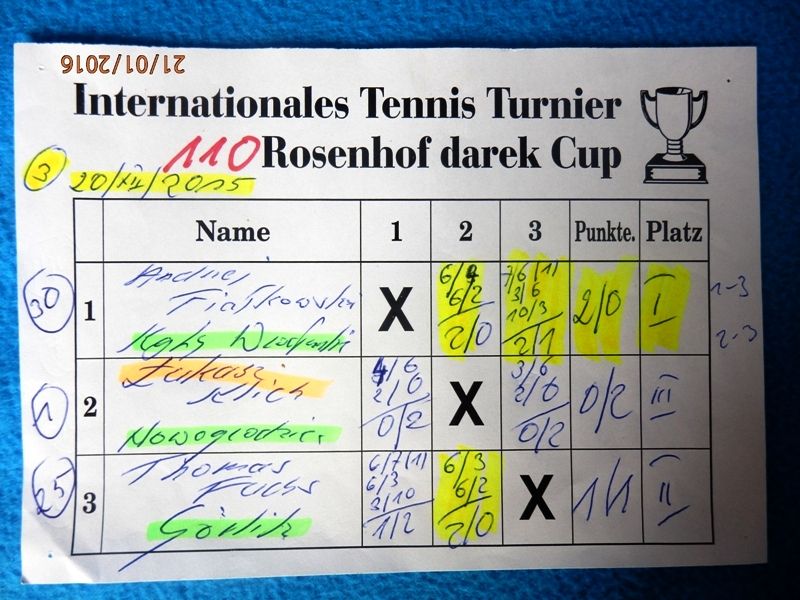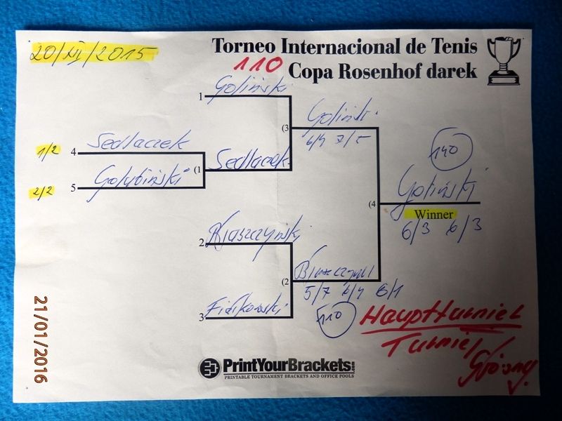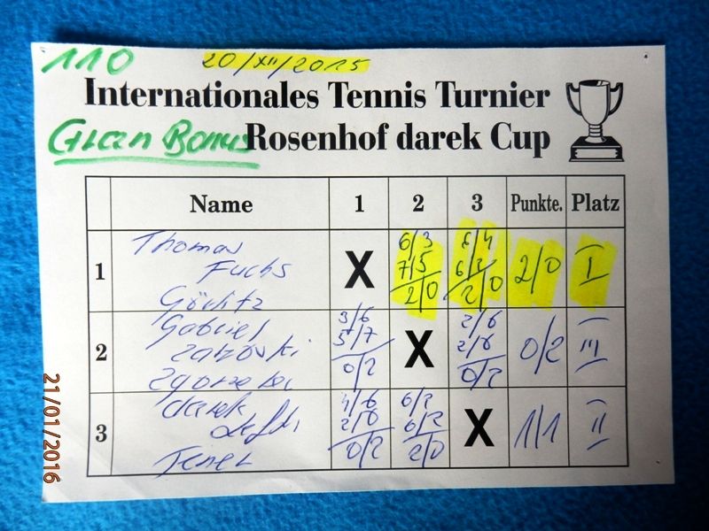 110 Międzynarodowy Turniej Tenisa ROSENHOF darek CUP, Görlitz 20 Grudnia 2015 - Kameralny turniej z wieloma miłymi gośćmi i dramatycznymi wydarzeniami na korcie. Mili goście, to rodzice póżniejszego tryumfatora turnieju Jakub Golińskiego z Poznania, którzy obejrzeli cały finałowy mecz!