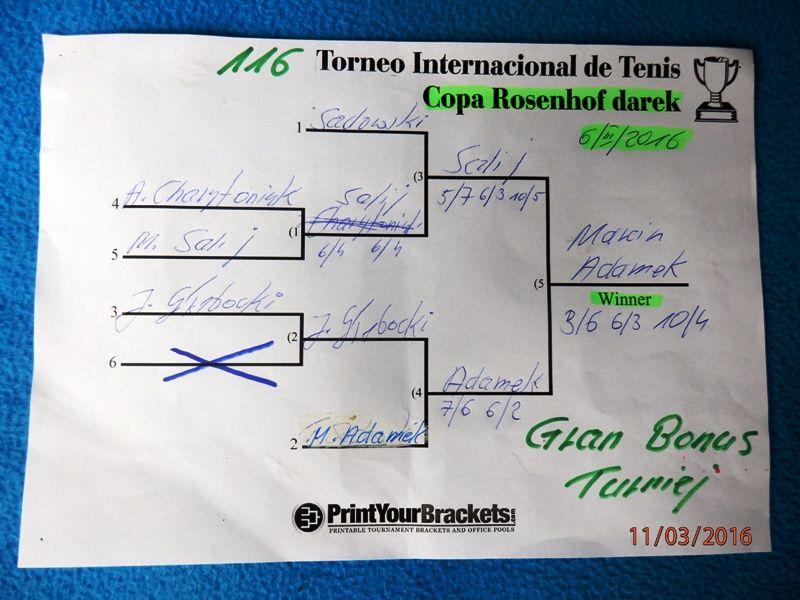 Ciekawe spotkania, odbyły się w Gran Bonus Turnieju. W meczu półfinałowym, Michał Salij Kąty Wrocławskie, dopiero w decydującym Tiebreak-u 10/5 pokonał Tomasz Sadowski Lubań Śl. Natomiast sam finał, to już dramatyczna "batalia" z wieloma intensywnymi wymianami. Michał Salij trapiony skurczami a turniejowy Debiutant Marcin Adamek Żary - zajęty był, popisywaniem się spektakularnymi punktami ! które doprowadziły go do końcowego zwycięstwa.