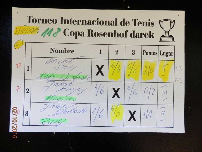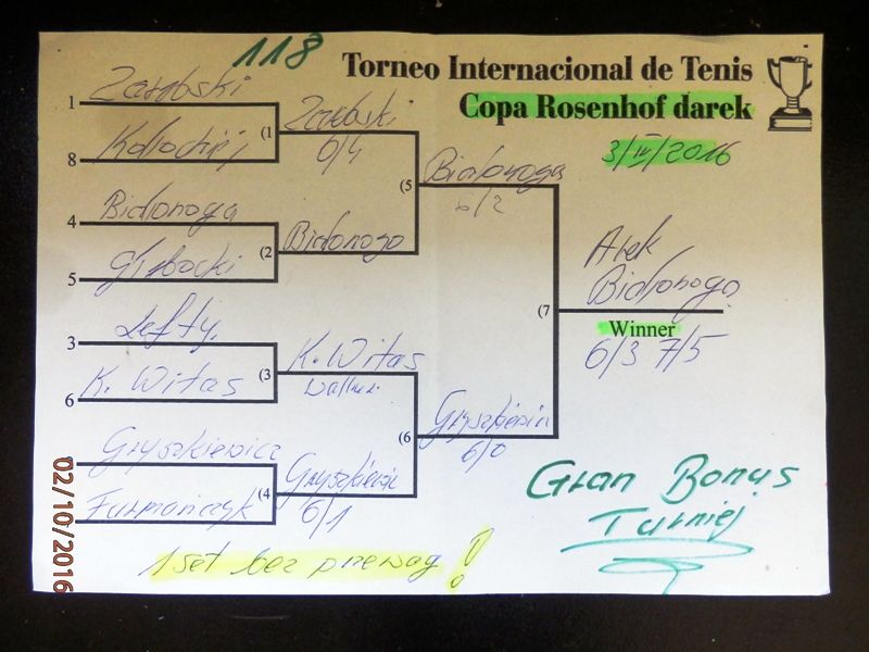 Ponownie, świetny występ, zanotował weteran - 67 letni zawodnik z Oleśnika, pan Edward Gryszkiewicz. Edward w 117 RdC, a więc dwa tygodnie wcześniej, wygrał Pequenio Bonus Turniej (jest to turniej klasy „B”) a teraz w 118 RdC dotarł do finału Gran Bonus Turnieju a więc turniej klasy „A” świetny awans i świetna gra. Nazwy turniejów są hiszpańskie – pomysł darka czyli mój………szczegóły w regulaminie na mojej stronie www.tennis-darek.net