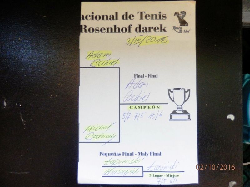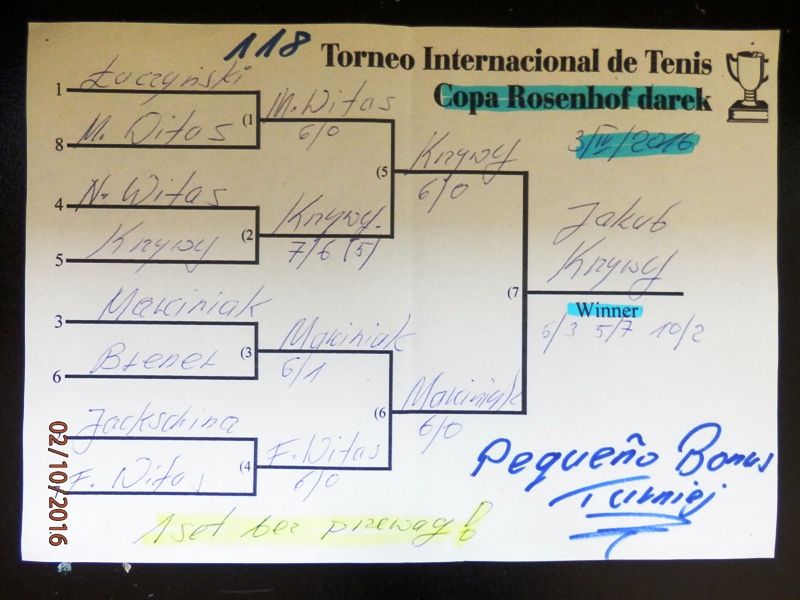 Fajną przygodę zaliczył Jakub Krzywy z Mogilna – Jakub wygrał swój pierwszy turniej w całej historii startów w Turniej Rosenhof darek Cup a zaliczył ich aż 6! W finałowym meczu, Pequeńo Bonus Turnieju, rozgrywanego w ramach 118 RdC – pokonał w trzech setach 6/3 5/7 10/2 Daniel Marciniak z Jeleniej Góry. Gratulacje Jakub !