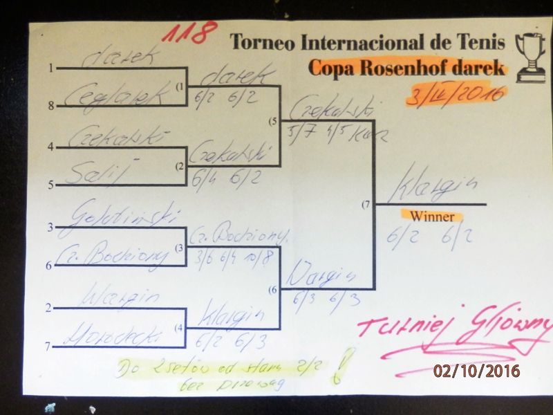 W regularnym 118 Turnieju Rosenhof darek Cup, tryumfował Bartosz Wargin z Gorzowa Wielkopolskiego, w finale pokonał 6/2 6/2 Hubert Czekalski z Żar. Mecz raczej bez żadnej historii, Hubert chyba był zmęczony swoim półfinałowym spotkaniem z darkiem. A